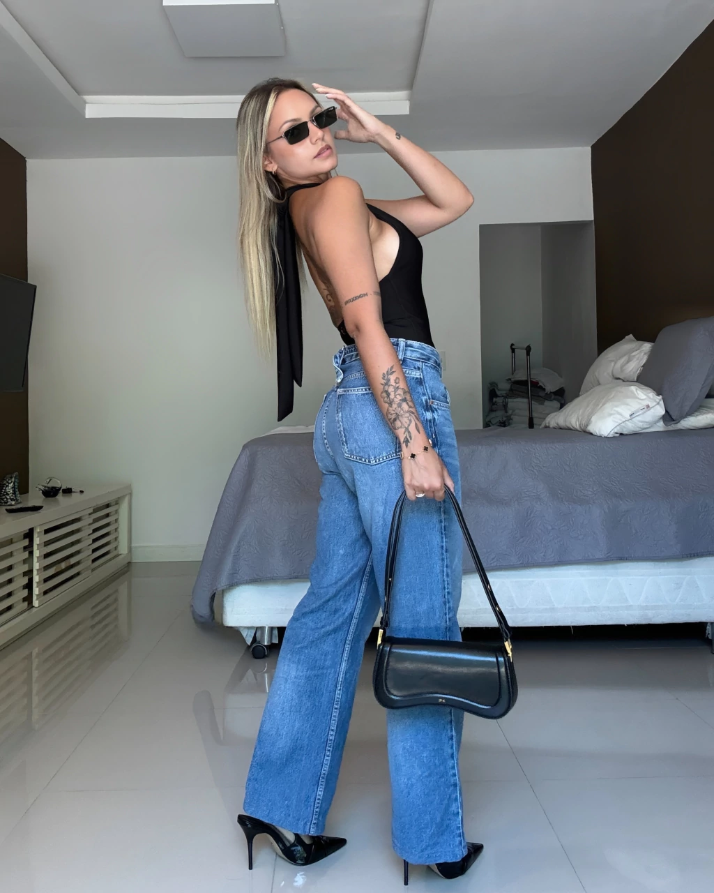 As peças com frente única estão em alta e nunca saem de moda, é exatamente o tipo de tendência que amamos. Blusa Classy é toda dupla (100% forrada no mesmo tecido). O tecido é um crepe de malha super encorpado e confortável ao toque. Possui elástico em TODO o decote, desde uma lateral do busto até a outra, passando por toda as costas para que fique mais segura. A "gola" é uma grande faixa que você amarra e regula de acordo com a largura do seu pescoço. Ela é uma blusa que cumpre também a proposta de um body, ou seja, 2 em uma.. girl's math ;) E para finalizar, tem esse detalhe em pregas na frente e nossa medalhinha personalizada, na cor bronze, no decote atrás.