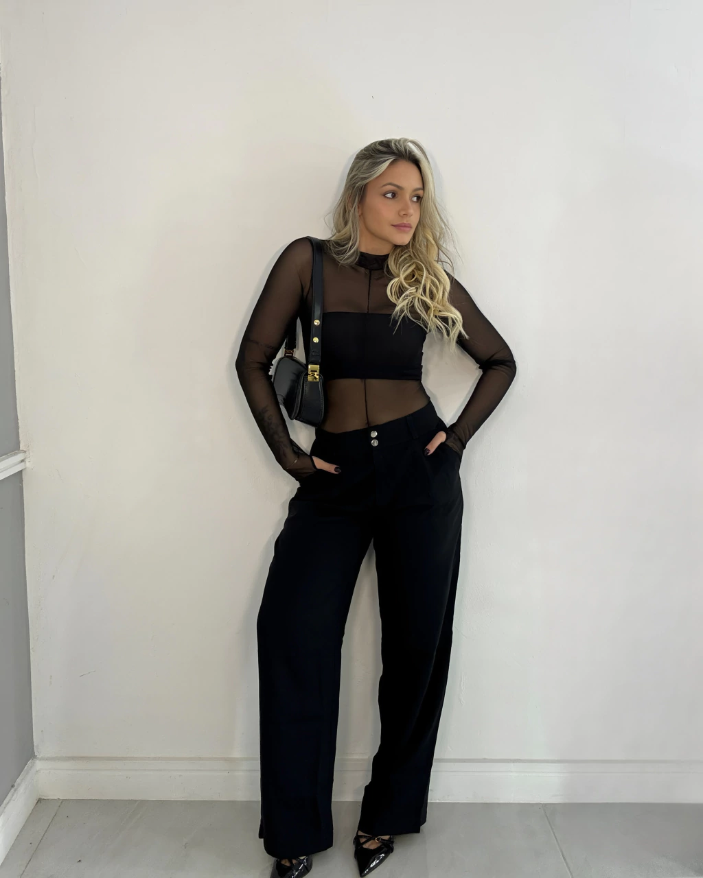 Blusa em tule com detalhe de costura central, golinha e abertura para o dedo no punho. Acompanha top faixa todo duplo em poliamida de alta qualidade e alta sustentação. Você consegue usar na proposta de blusa ou como se fosse um body.