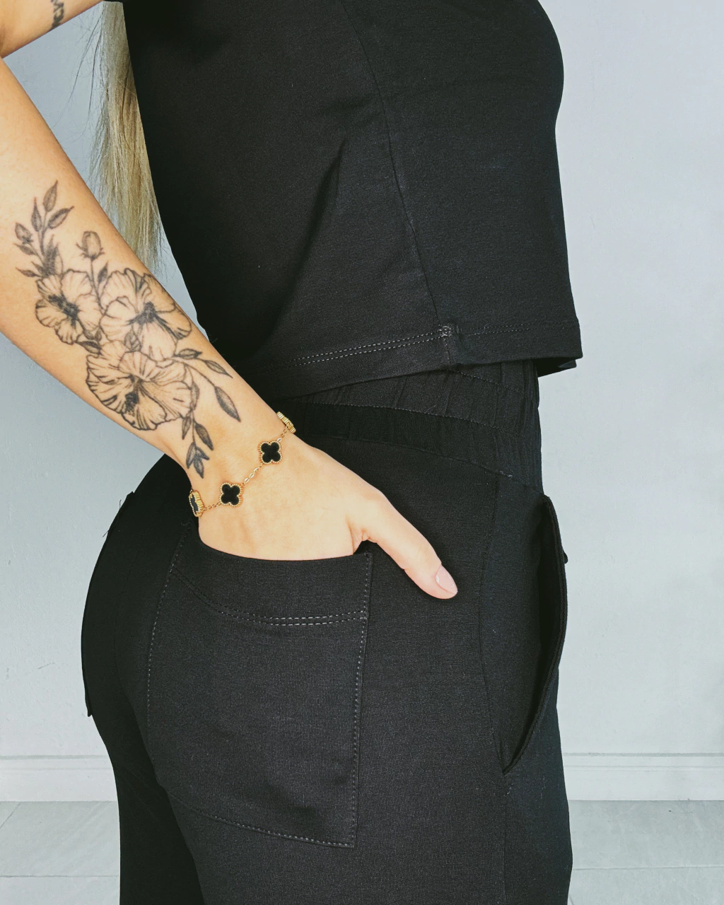Um conjunto que vai ser seu melhor amigo para todas as horas. É sério, para TODAS as horas. O tecido é moletinho (o melhor em qualidade do mercado nacional) de alta gramatura, grossinho, bem pesado e macio, o que proporciona um caimento impecável e muito conforto. A modelagem valoriza o corpo de forma elegante, possui 4 bolsos funcionais e na cintura um elástico largo e que não cede com o tempo, firme sem apertar ou incomodar. Além disso, o que é mais versátil que um conjunto "básico" de extrema qualidade e conforto? Que te permite usar as peças separadas em outras combinações, com peças que você já tem no closet..?