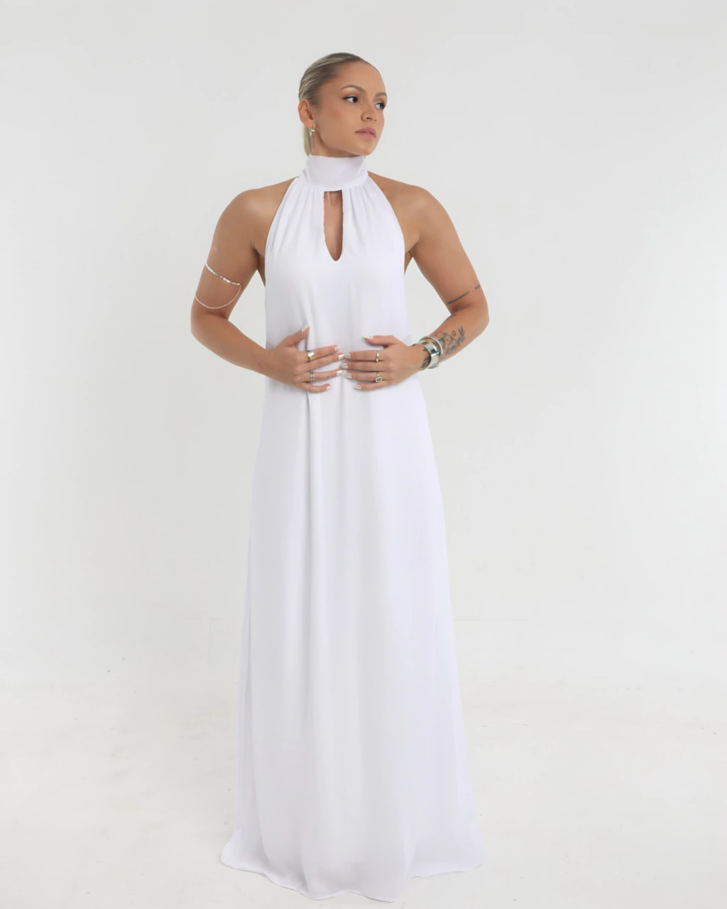 Nosso primeiro vestido linha festa. Long e elegante, com tecido de crepe (Crepe GGT), 100% forrado em tecido geladinho e macio ao toque por dentro, acabamento nobre e limpo, zíper invisível nas costas e longa faixa para amarração no pescoço. Em breve estará disponível para produção exclusiva sob encomenda na cor de sua escolha.